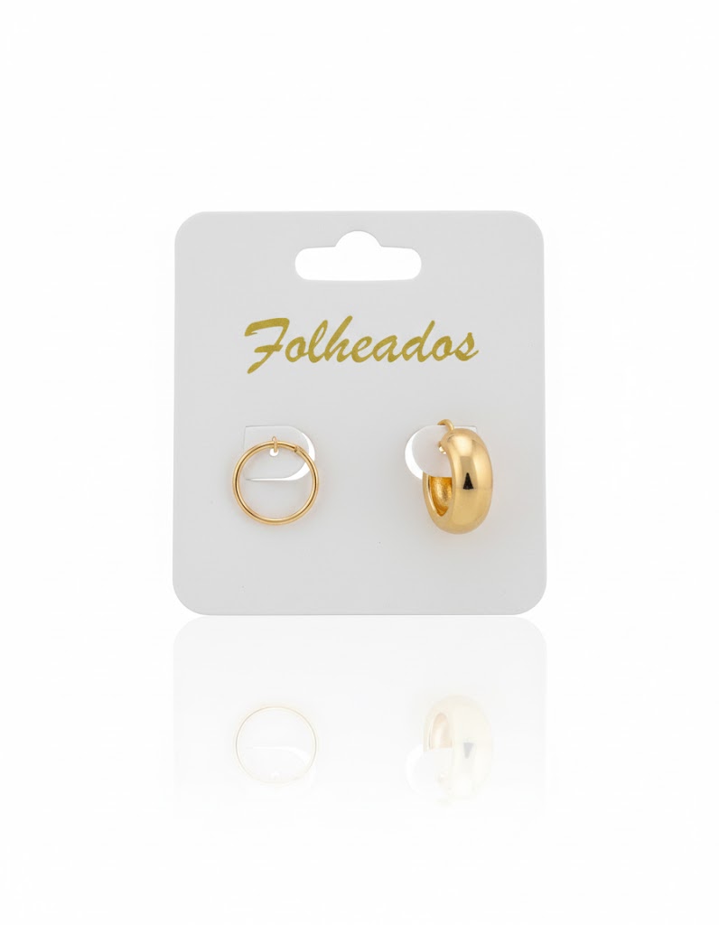 O Kit Dupla de Brincos Argola Folheada é o acessório perfeito para quem busca um visual minimalista, moderno e versátil. Este conjunto oferece um mix de estilos em banho dourado, ideal para compor um ear stack (conjunto de brincos para múltiplos furos) sofisticado.