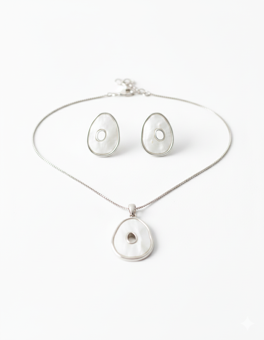 Este Conjunto de Folheados combina o minimalismo com a sofisticação das formas fluidas. Com um design oval/orgânico e contemporâneo, a peça centraliza-se em um detalhe branco leitoso, semelhante à Madrepérola ou Resina de alto brilho, envolvida por um aro prateado.