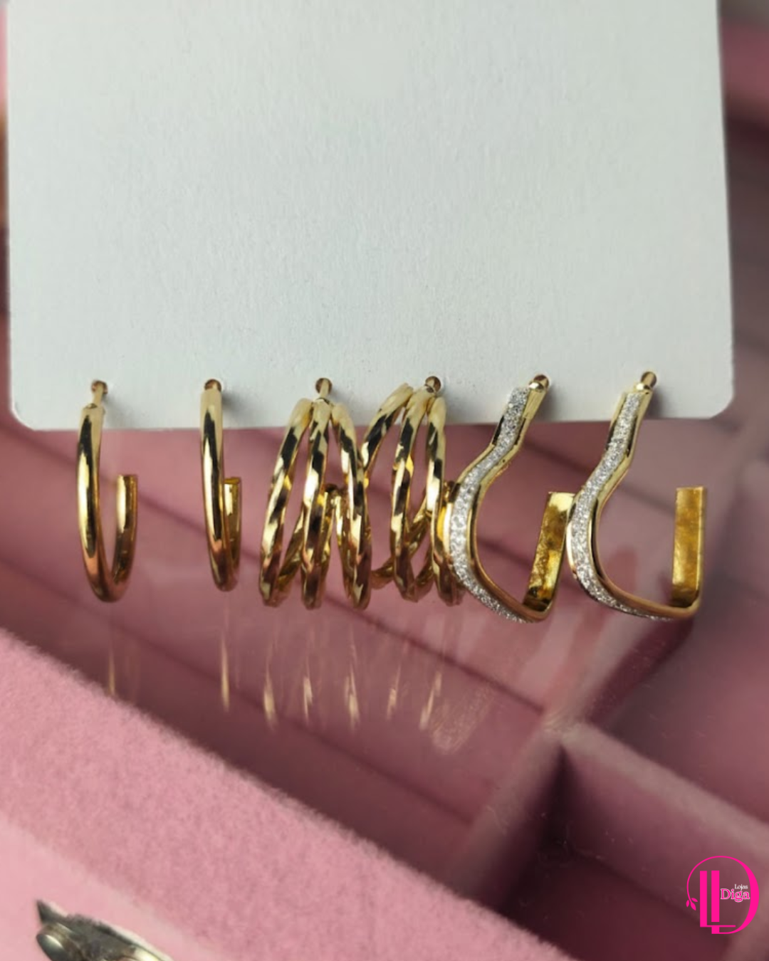 Trio de argolas em bijuteria dourada, com design moderno e delicado. O conjunto inclui dois modelos clássicos e uma argola em formato de coração com detalhe em strass, que traz um toque romântico e sofisticado.