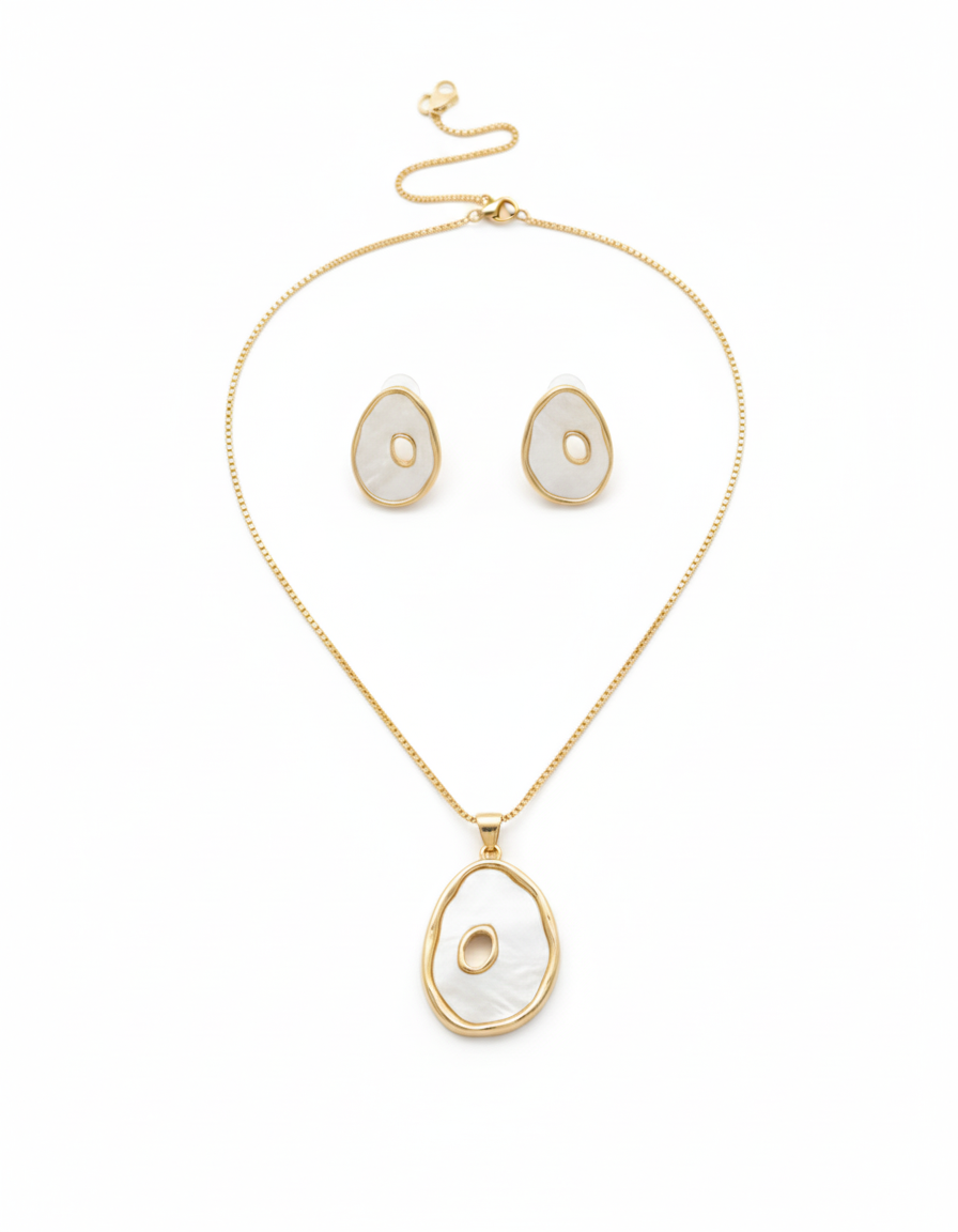 Este conjunto exala sofisticação atemporal. Apresentando um design moderno e levemente vazado na forma oval, a pedra branca central reflete a luz com um brilho suave e discreto, dando um toque de luxo e durabilidade. Perfeito para realçar a beleza em qualquer ocasião, seja no dia a dia ou em eventos especiais, adicionando um charme inconfundível ao seu visual.